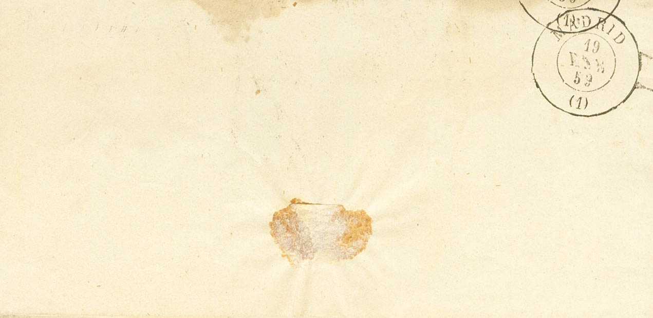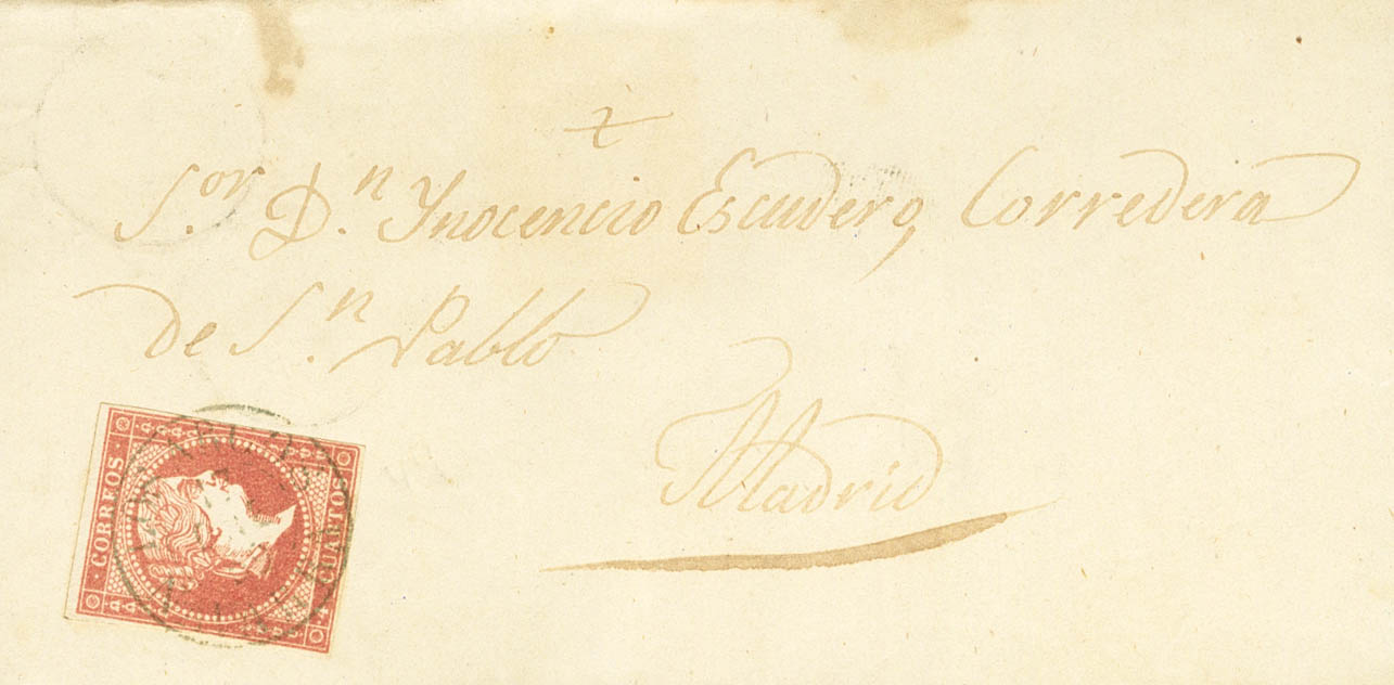 |ENVELOPE| 48. 1859. 4 red quarters. LOS AGoodOS to MADRID. Postmark LOS AGoodOS / NAVARRA (Type I). MAGNIFICENT AND RARE.