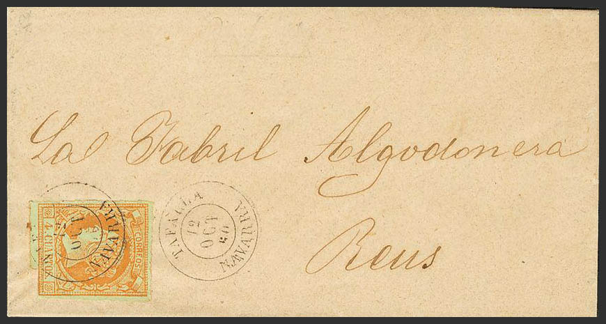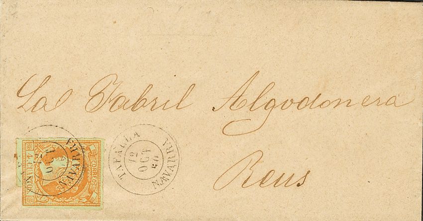 52. 1860. 4 orange cuartos . TAFALLA to REUS. Postmark TAFALLA / NAVARRA. MAGNIFICENT.