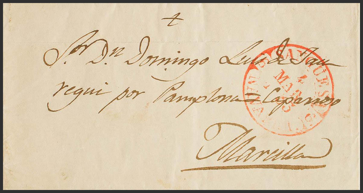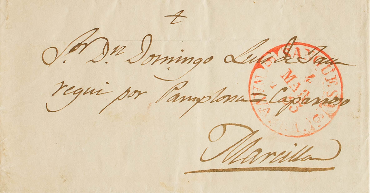 1853. SANGÜESA to MARCILLA. Baeza SANGÜESA / NAVARRA, in red. MAGNIFICENT.