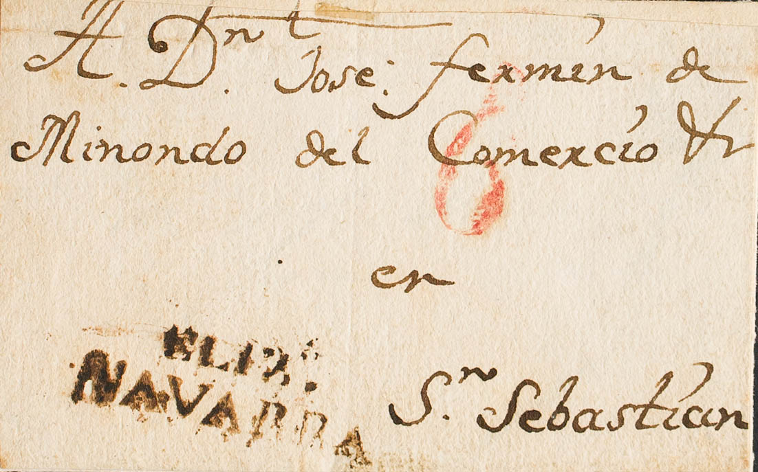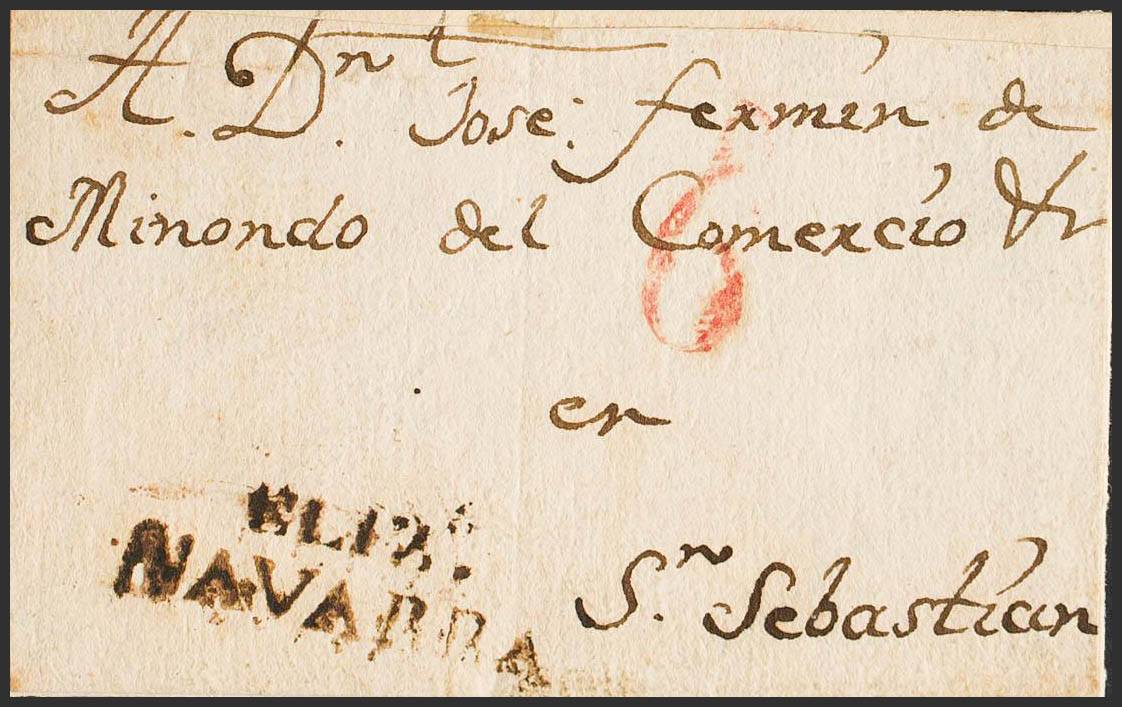 (1824ca). Front of ELIZONDO to SAN SEBASTIAN. ELIZº / NAVARRA brand, in writing ink. MAGNIFICENT AND RARE.