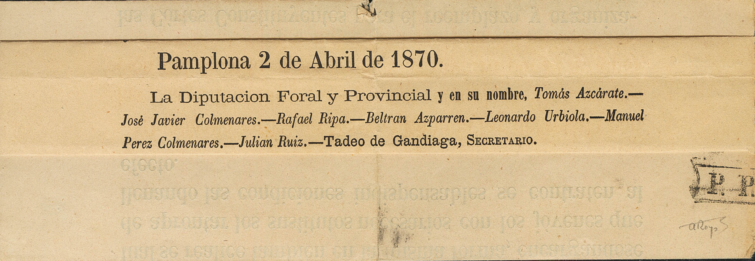 1870. Printed by the Navarre Provincial Council of PAMPLONA. PP brand, in black from Pamplona (PE43) 2004 edition. MAGNIFICENT AND EXTREMELY RARE.