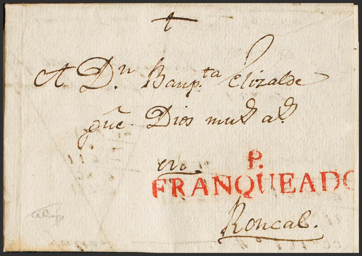 English 1808. PAMPLONA to RONCAL. Mark P. / FRANQUED, in red (PE35) 2004 edition. MAGNIFICENT AND RARE.