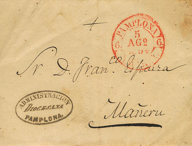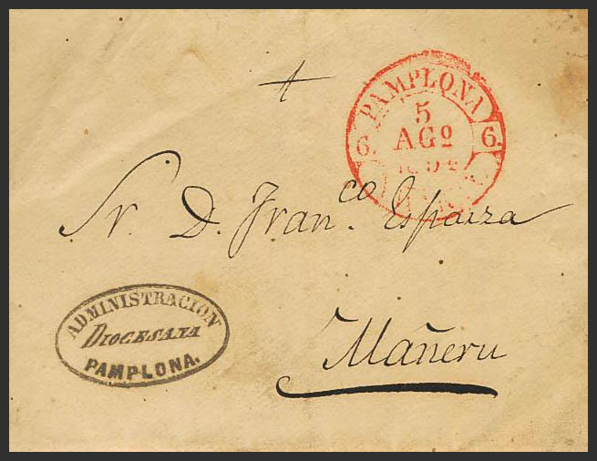 1854. PAMPLONA to MAÑERU. Baeza PAMPLONA / NAVARRA and mark ADMINISTRACION / DIOCESANA / PAMPLONA. MAGNIFICENT AND RARE.