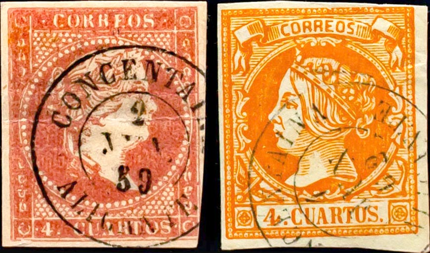 48, 52. 1855. Set of two stamps of 4 cuartos red and 4 cuartos yellow, unused with CONCENTAINA / ALICANTE postmark. MAGNIFICENT.