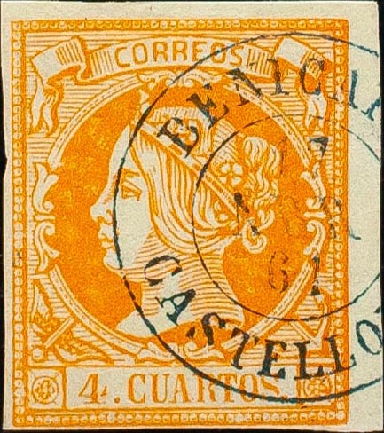 English 52. 1860. 4 cuartos yellow. Postmark BENICARLO / CASTELLON. MAGNIFICENT.