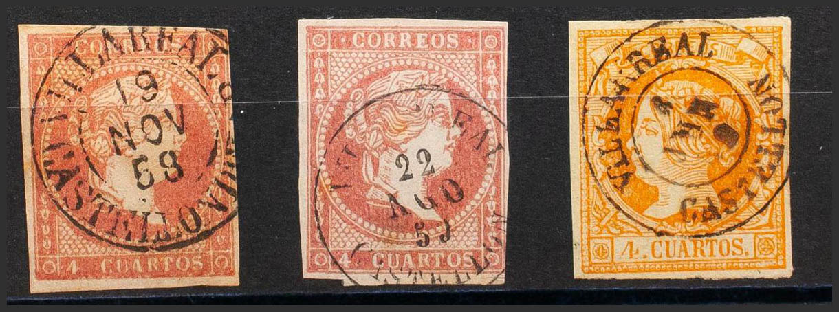 48(2), 52. (1855ca). Set of two unused stamps of 4 red cuartos (Type I and II) and 4 yellow cuartos with VILLAREAL / CASTELLON DE LA P. (Type I) and VILLARREAL / CASTELLON postmarks. MAGNIFICENT.