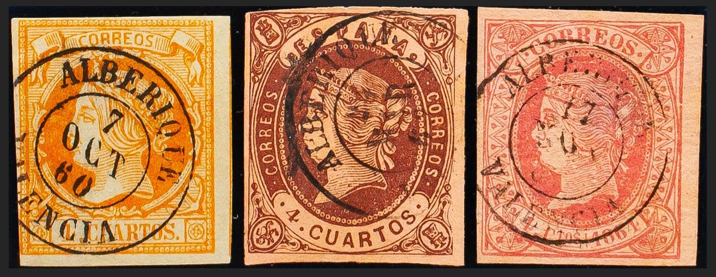 English 52, 58, 64. (1860ca). Set of three 4- cuartos yellow, brown and pink stamps, unused with the ALBERIQUE / VALENCIA postmark. MAGNIFICENT.