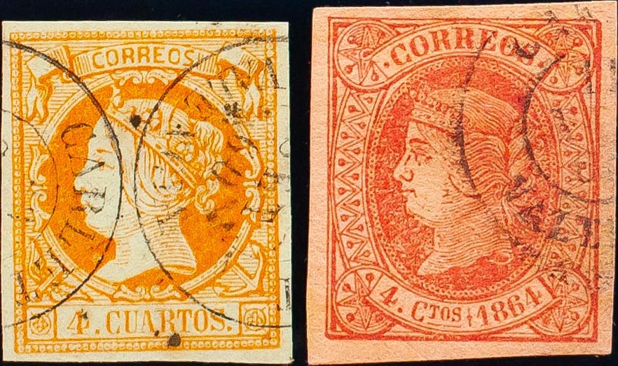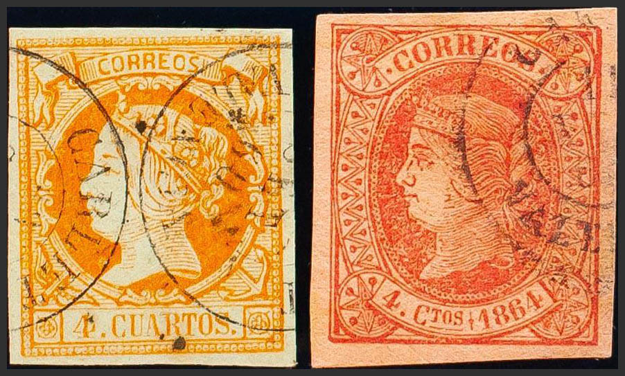English 52, 64. (1860ca). Set of two stamps of 4 cuartos yellow and 4 cuartos pink, unused with CARLET / VALENCIA postmark. MAGNIFICENT.