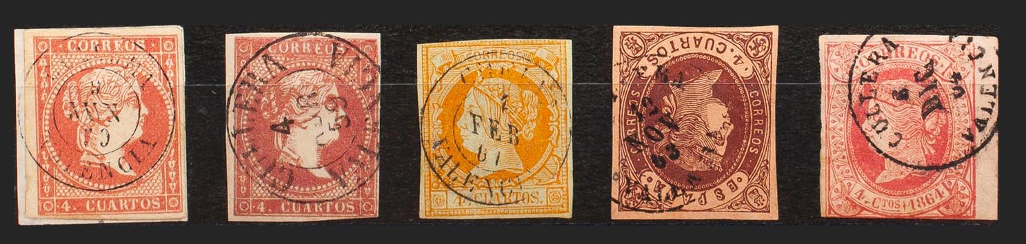 48(2), 52, 58, 64. (1855ca). Set of five 4- cuartos red, yellow, brown and pink stamps, unused with the CULLERA / VALENCIA postmark (including Type I on the 4- cuartos red). MAGNIFICENT.