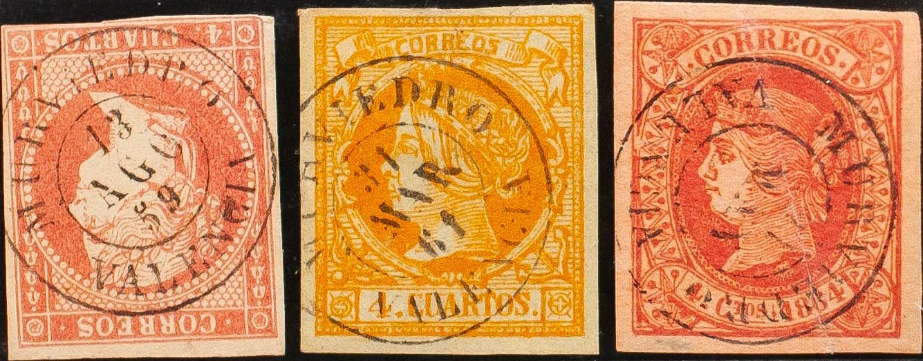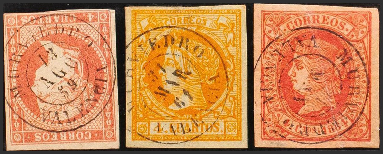 48, 52, 64. (1855ca). Set of three 4- cuartos red, yellow and pink stamps, unused with the MURVIEDRO / VALENCIA postmark. MAGNIFICENT.