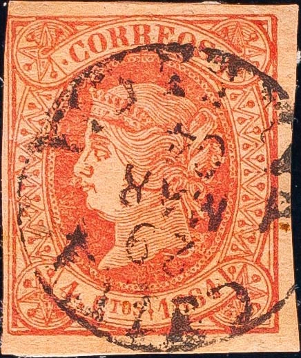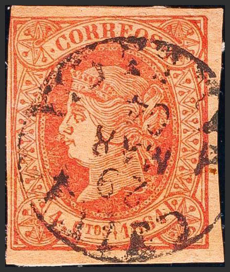 64. 1864. 4 pink cuartos . CHIVA / VALENCIA postmark (Type I). MAGNIFICENT AND VERY RARE, NOT CATALOGED IN LAIZ.