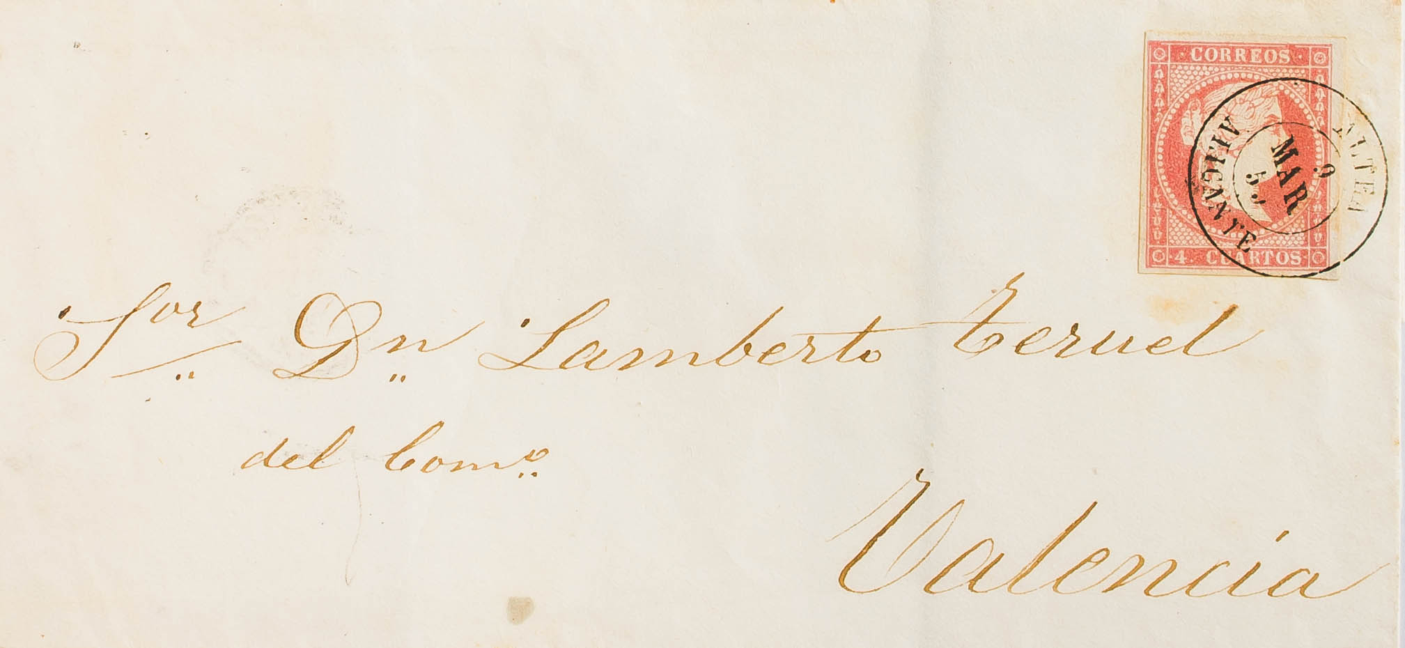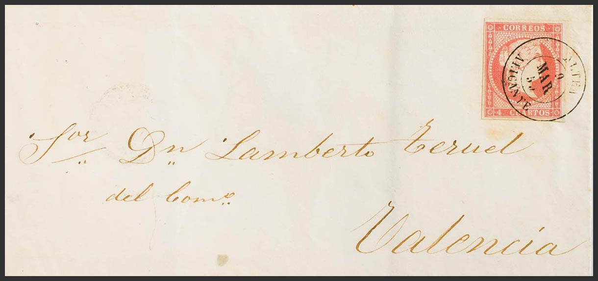 48. 1859. 4 red cuartos . ALTEA to VALENCIA. Postmark ALTEA / ALICANTE. MAGNIFICENT AND RARE.