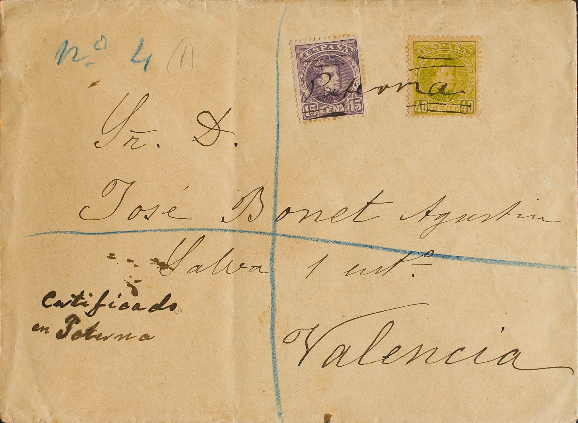 246, 250. 1904. 15 cts violet and 40 cts olive. Certificate from PATERNA (VALENCIA) to VALENCIA. Handwritten postmark "Paterna" and on the front "Certified in Paterna". MAGNIFICENT AND VERY RARE.
