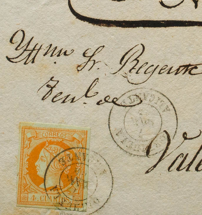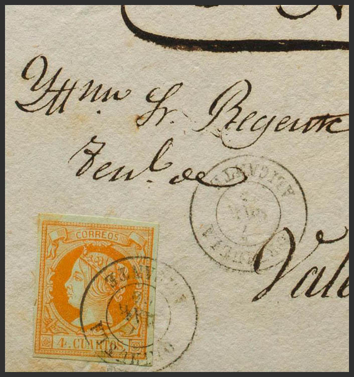 △ 52. 1860. 4 orange cuartos , on fragment. Postmark ORIHUELA / ALICANTE. MAGNIFICENT.