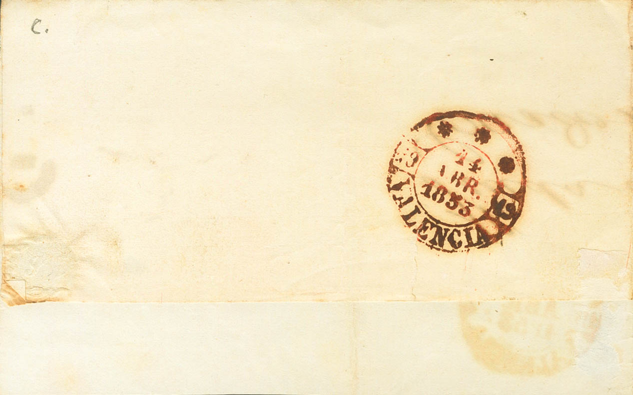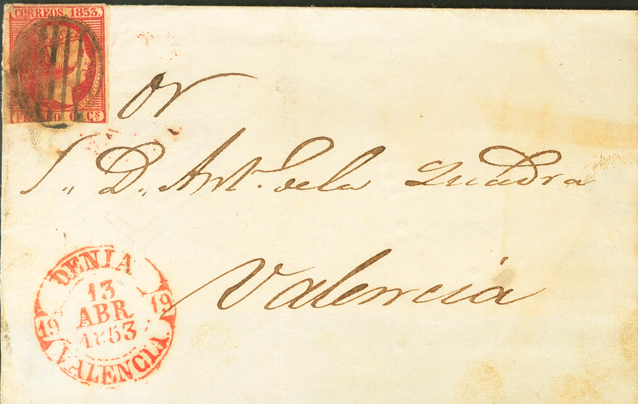 |ABOUT| 17. 1853. 6 pink quarters. Front (with flap on the back) from DENIA to VALENCIA. On the front Baeza DENIA / VALENCIA. NICE.