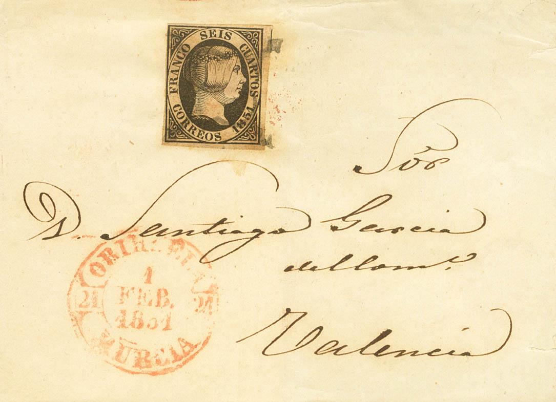 |ABOUT| 6. 1851. 6 black quarters. ORIHUELA (ALICANTE) to VALENCIA. On the Baeza front ORIHUELA / MUGoodIA. MAGNIFICENT.
