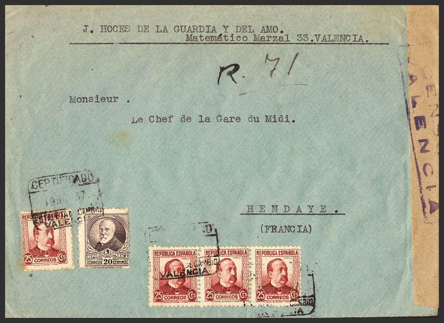 666, 685(4). 1937. 20 cts and 25 cts, four stamps. Certificate from VALENCIA to HENDAYE (FRANCE). On the back arrival. MAGNIFICENT.