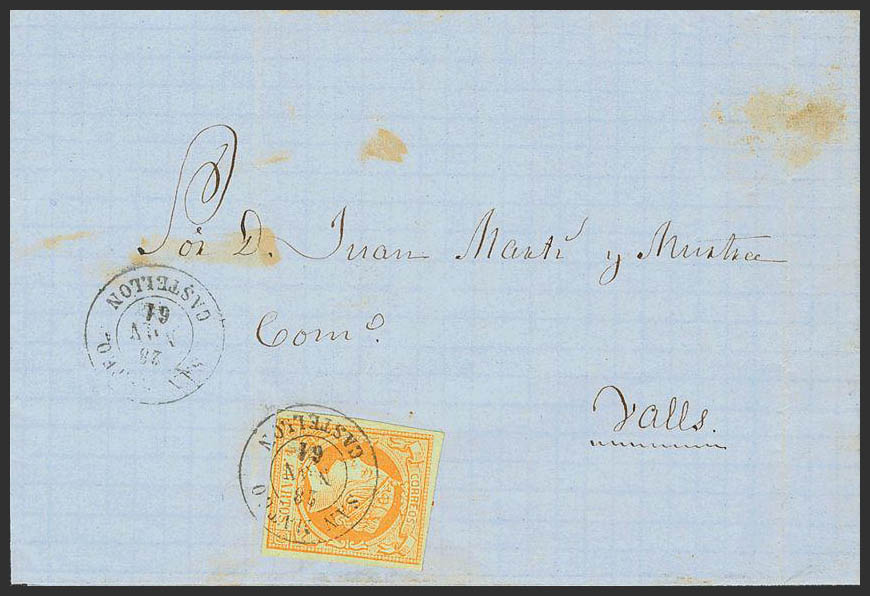 English 52. 1861. 4 orange cuartos . SAN MATEO to VALLS. Postmark SAN MATEO / CASTELLON. MAGNIFICENT AND RARE.
