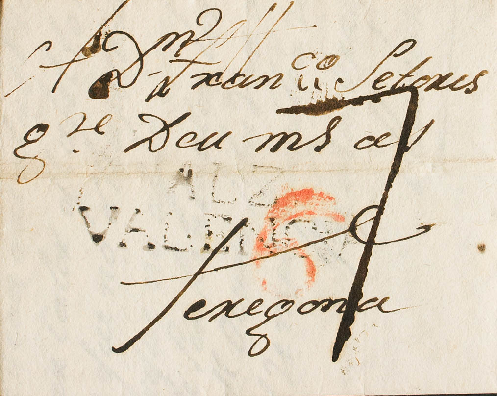 1806. CARLET to TARRAGONA. ALZ brand. / VALENCIA, from Alcira (PE1) 2004 edition and CDA mark on the back. CRO., applied upon arrival in Tarragona (PE24) 2004 edition. MAGNIFICENT PRINTING AND EXTREMELY RARE IN THIS EXCEPTIONAL QUALITY.
