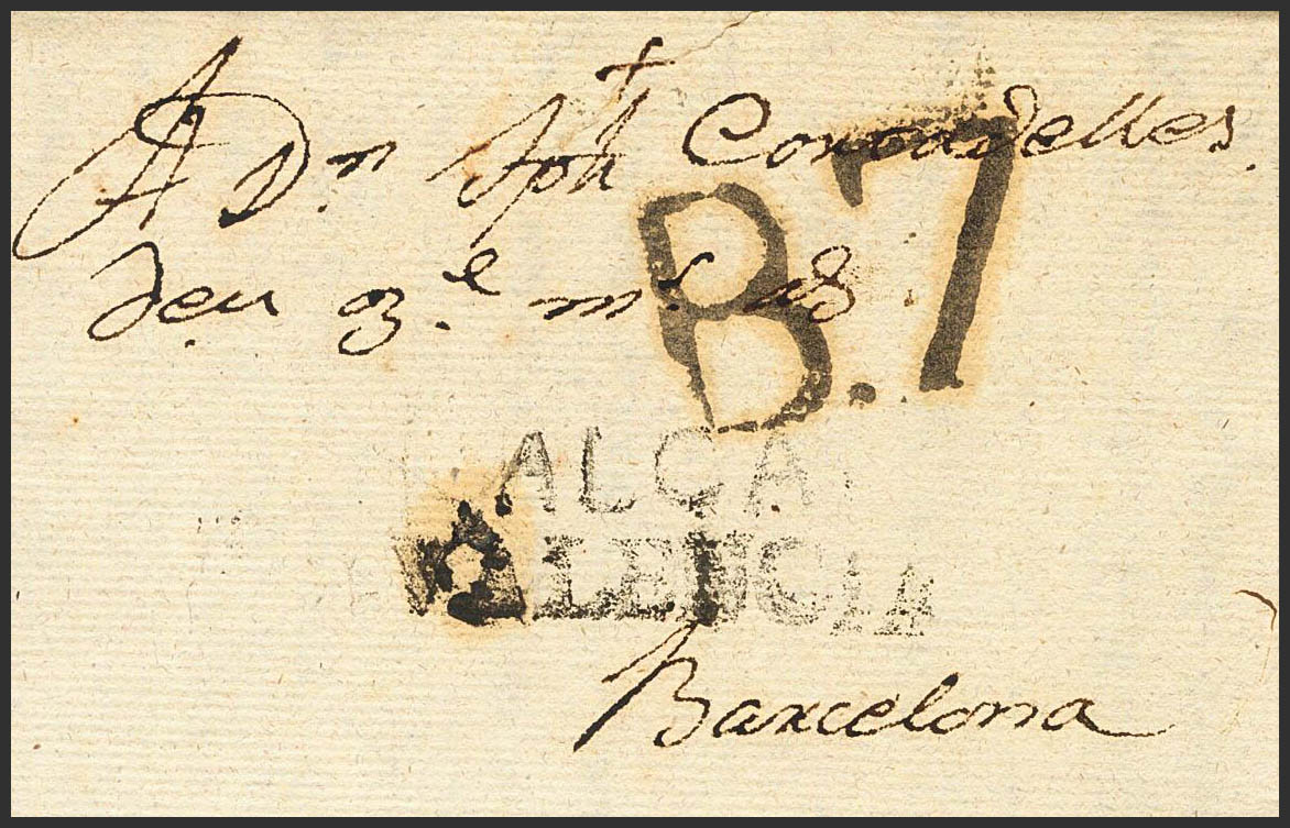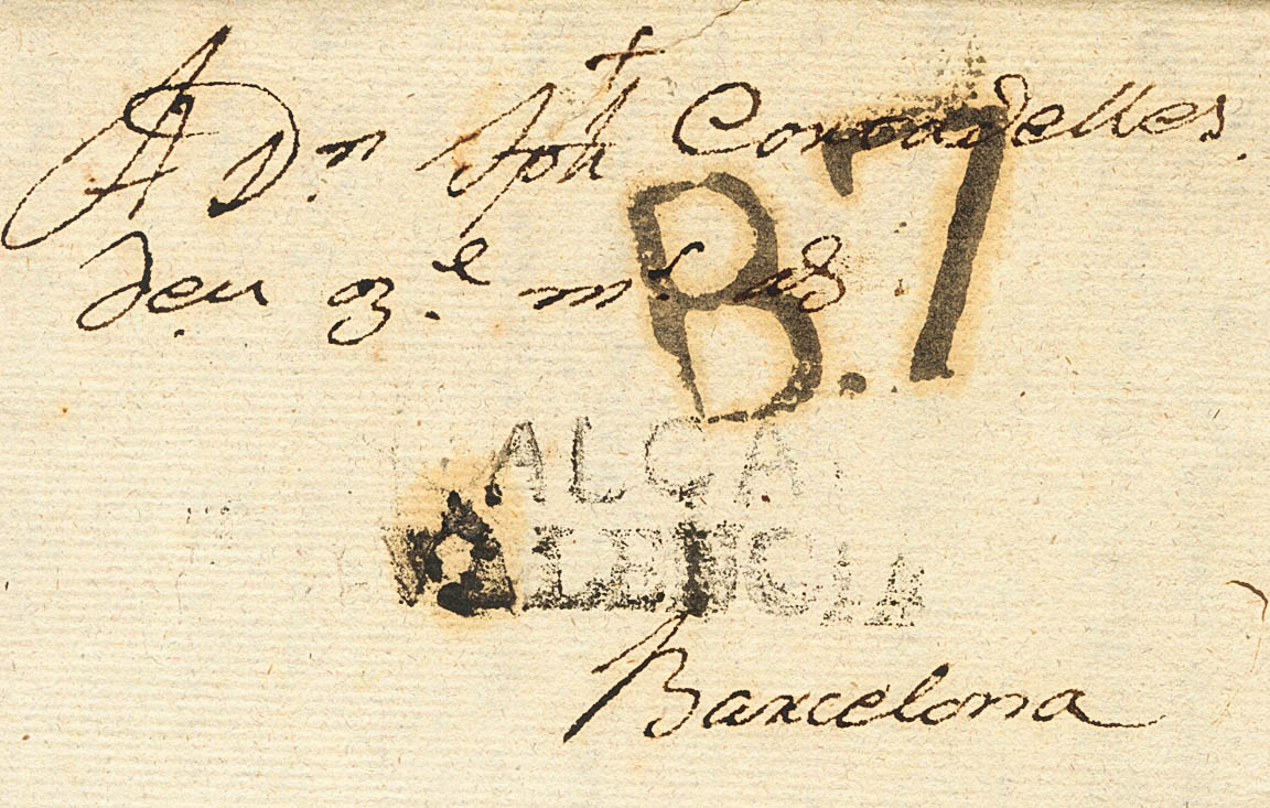 1808. CABANES to BARCELONA. FTAA brand. / VALENCIA, in black from Alcalá de Chivert (PE2) 2004 edition. MAGNIFICENT AND VERY RARE.