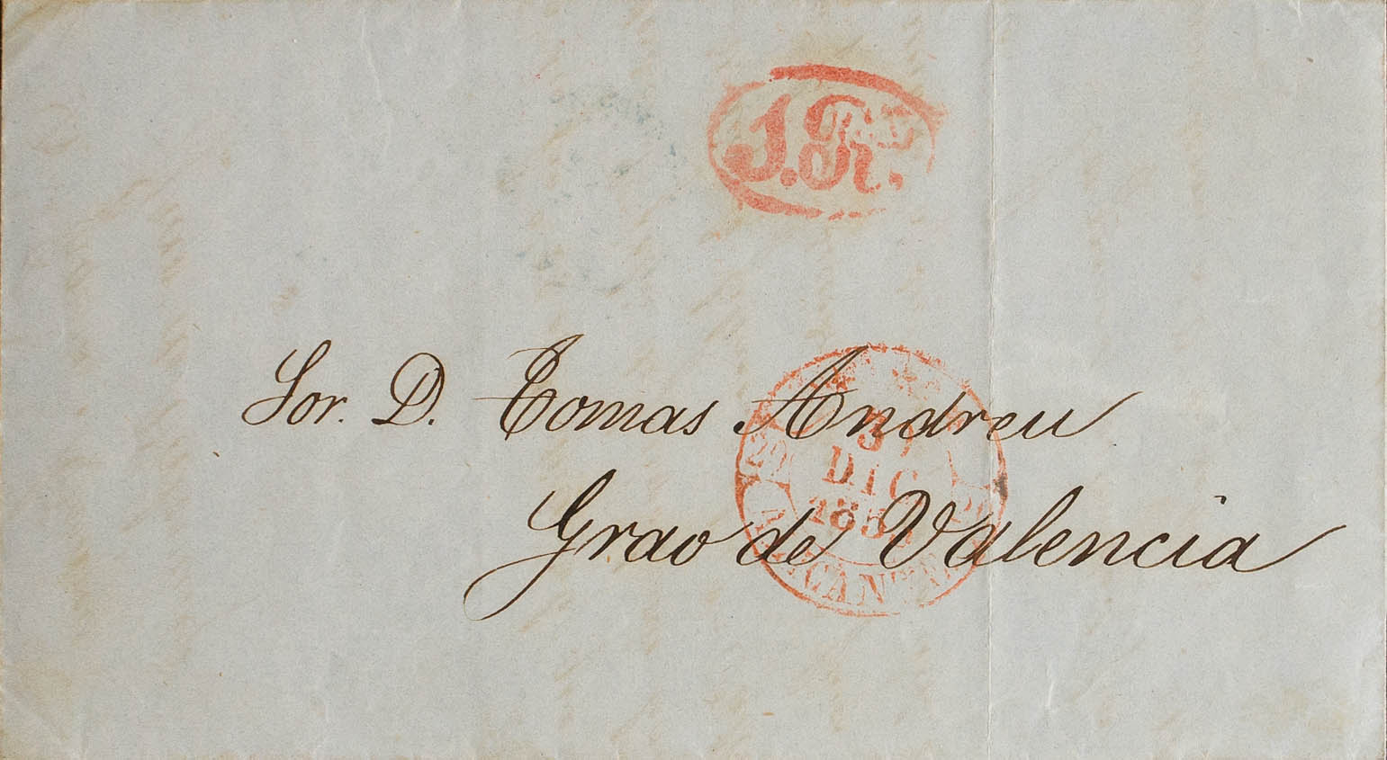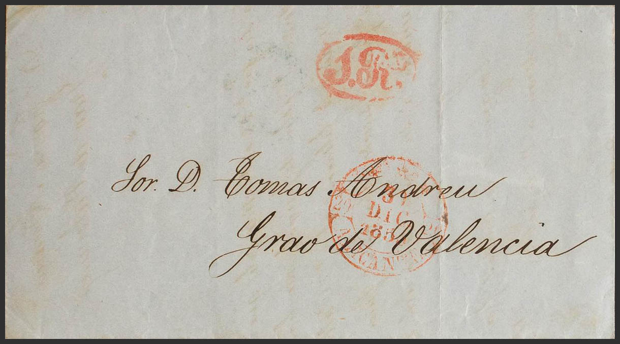 1853. ALICANTE to VALENCIA. Baeza *** / ALICANTE and portage "1R.", on the back handwritten "No stamps are sold". MAGNIFICENT AND VERY RARE.