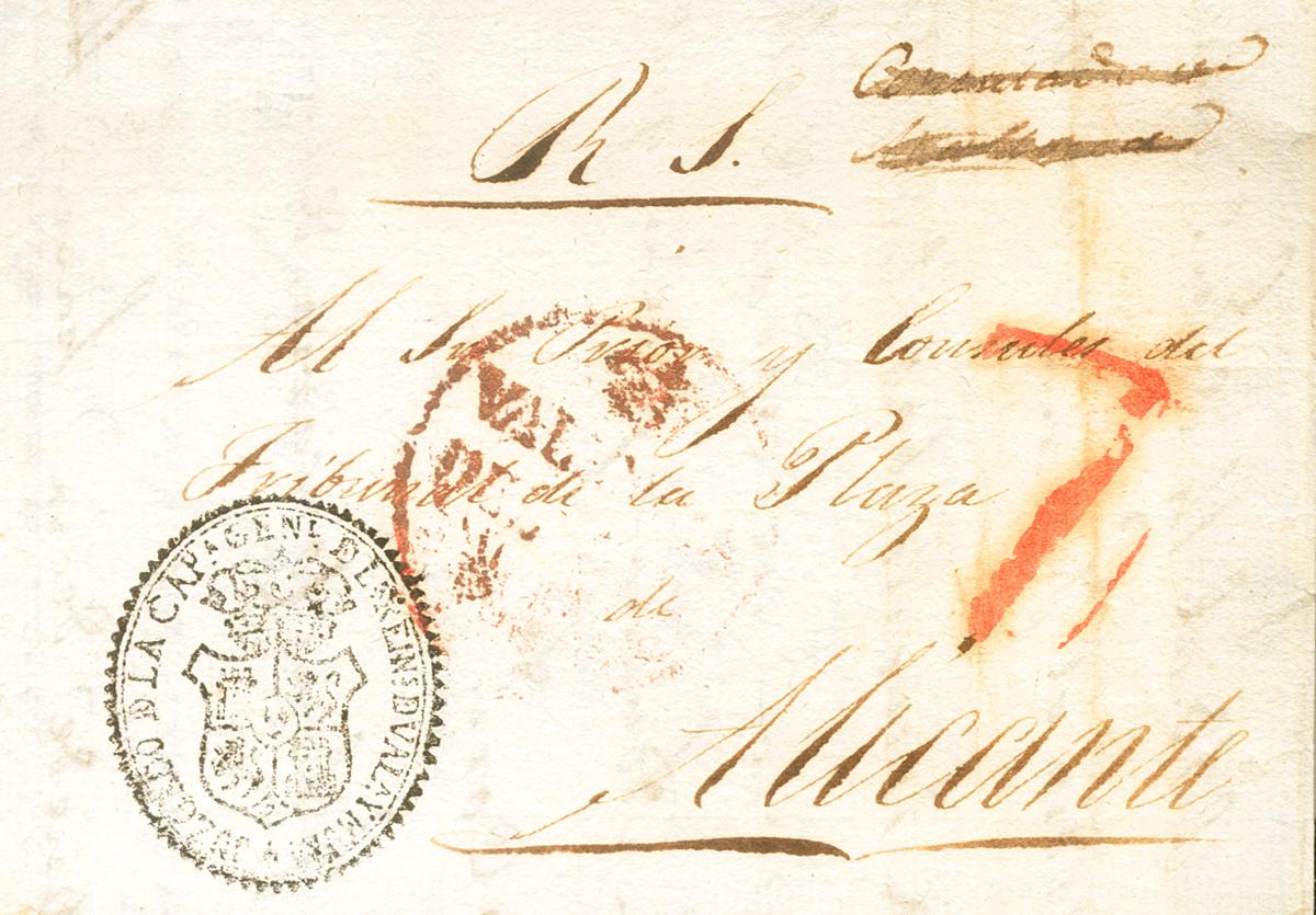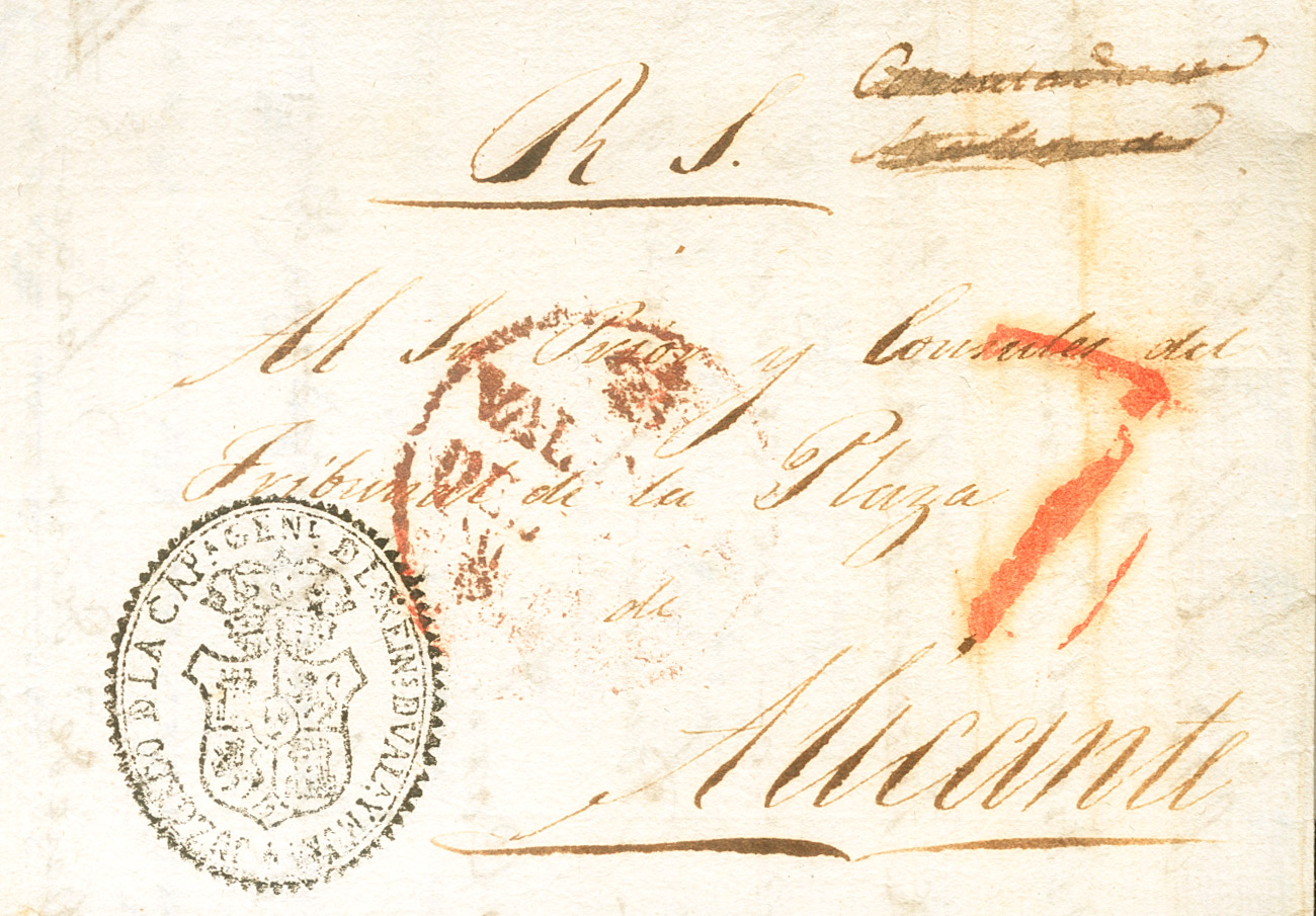 |ABOUT|(1838ca). VALENCIA to ALICANTE. Mark VALENCIA / DEL CID, in red and franchise JUZGADO DE LA CAPª GENL. DL REIN D VALª, in black. MAGNIFICENT AND VERY RARE.