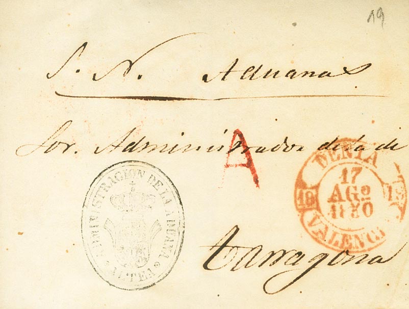 English |ABOUT|1850. ALTEA (ALICANTE) to TARRAGONA. CUSTOMS ADMINISTRATION / ALTEA stamp, in black, Baeza DENIA / VALENCIA and "A" for subscription, in carmine, from Valencia (PE37) 2004 edition. MAGNIFICENT.