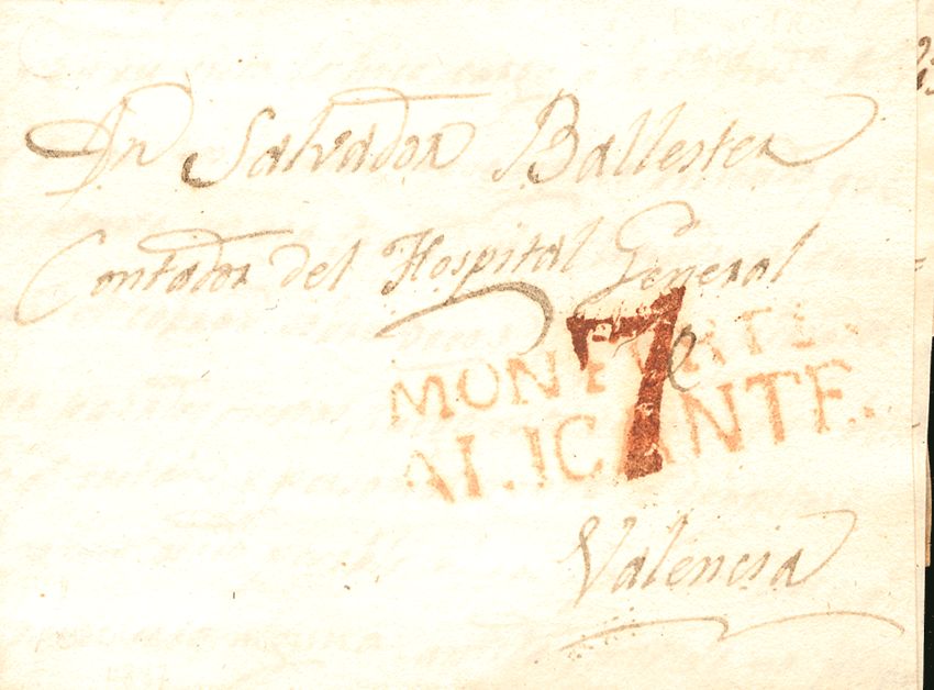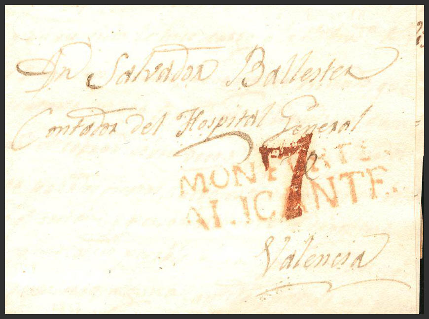1837. MONFORTE to VALENCIA. MONFORTE / ALICANTE brand, in red (PE1) 2004 edition. MAGNIFICENT.