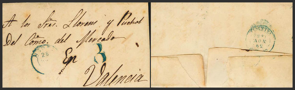 English 1855. MADRID to VALENCIA. Special CORREOS / VALENCIA dater on the back, in blue, of arrival (PE42) 2004 edition. MAGNIFICENT.
