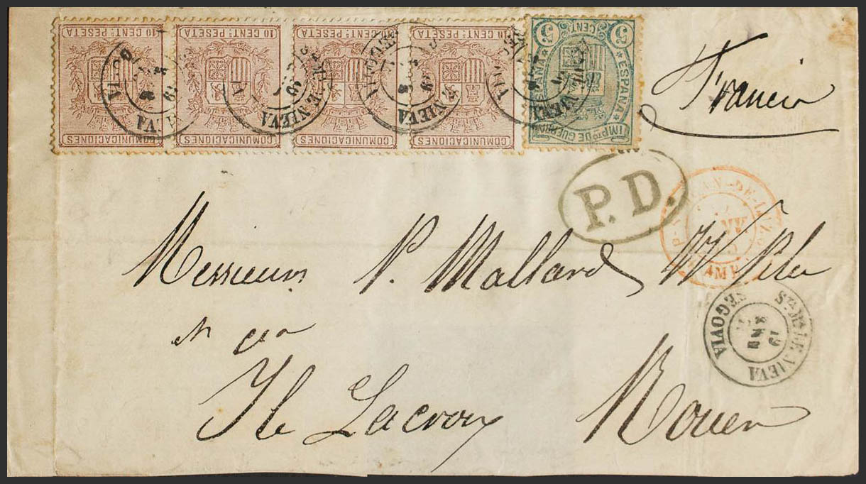 153(4), 154. 1875. 10 cts chestnut, strip of four and 5 cts green. SANTA MARIA DE NIEVA to ROUEN (FRANCE). Postmark STª Mª DE NIEVA / SEGOVIA, the War Tax stamp was unnecessary for letters addressed abroad. MAGNIFICENT AND SPECTACULAR AND VERY RARE COMBINATION OF POSTAGE.