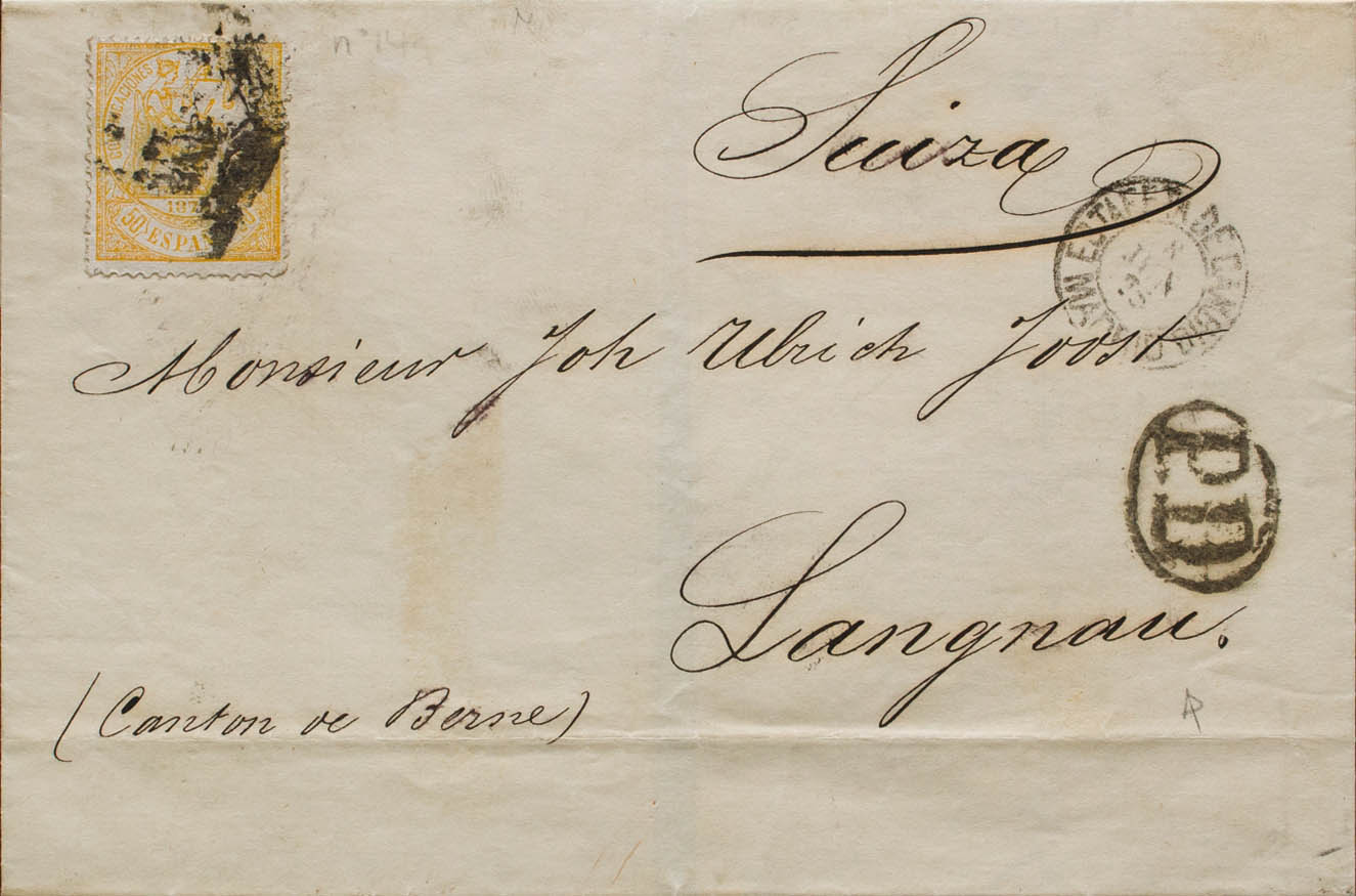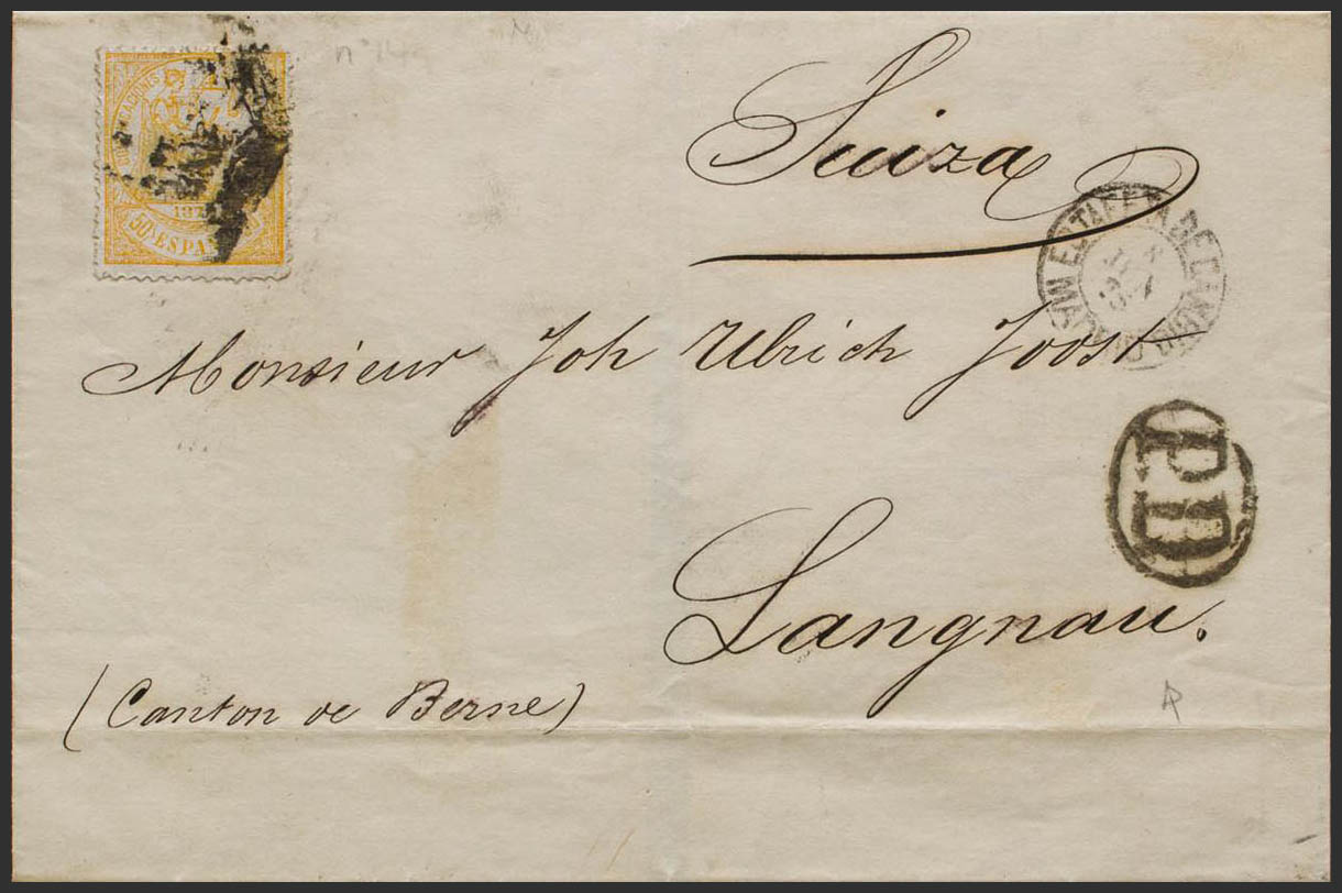 149. 1875. 50 cts yellow. MADRID to LAGNAU (SWITZERLAND). Simple postage rate to Switzerland before entry into the General Post Office. PRETTY.