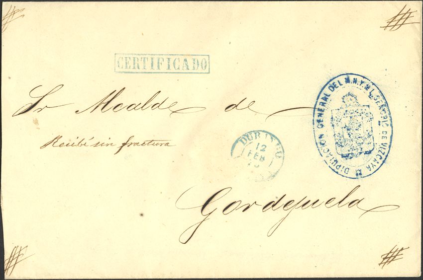 1875. Certificate from DURANGO to GORDEYUELA. CERTIFICATE linear mark, crosses in the corners and I received. MAGNIFICENT AND VERY RARE CERTIFIED LETTER FROM THE CARLIST MAIL.