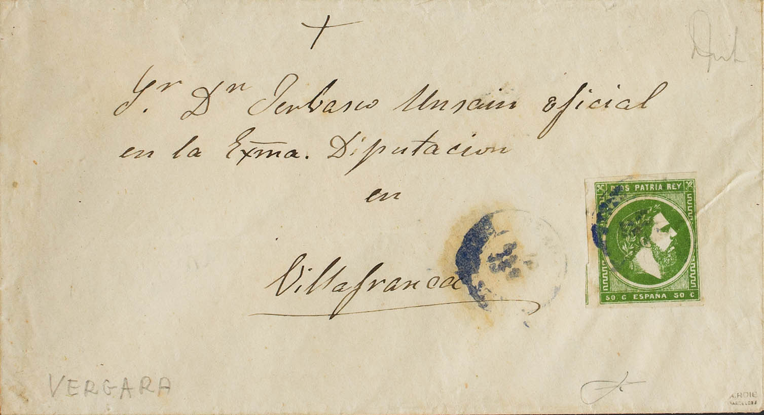 160. 1875. 50 cts green. VERGARA to VILLAFRANCA. Postmark (dated) VERGARA (not legible), in blue. MAGNIFICENT AND RARE.