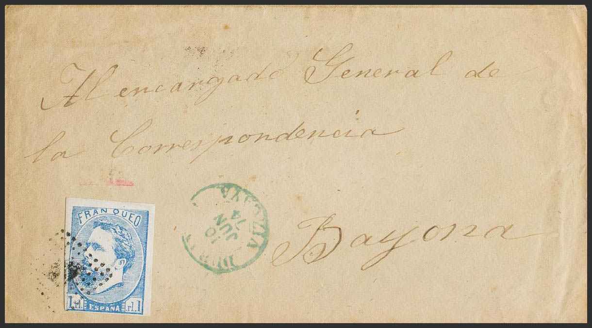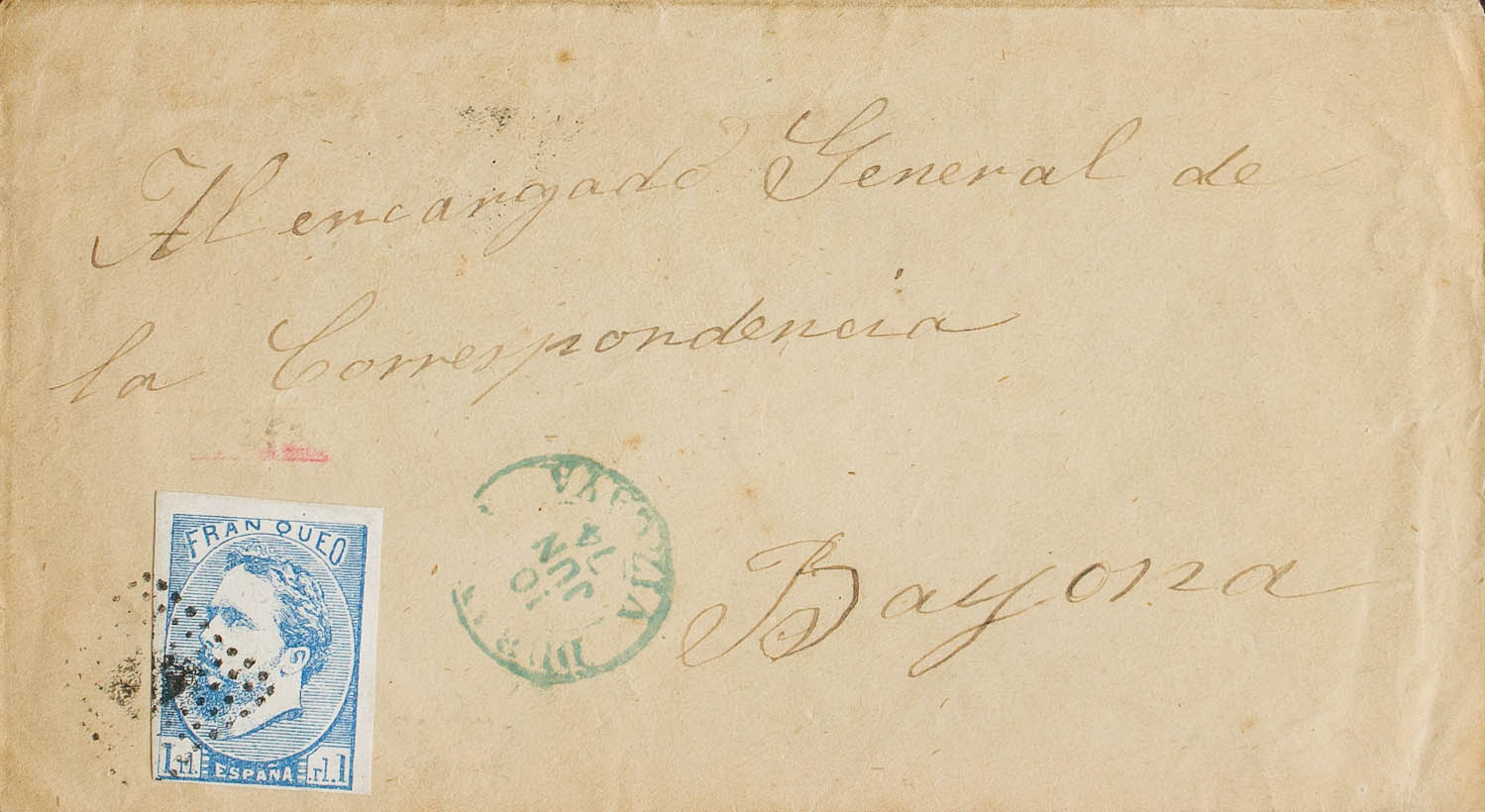 156. 1874. 1 real blue. DURANGO to BAYONNE (FRANCE). MAGNIFICENT AND RARE. Certificate CEM. Edifil 2016: 1,885 Euros