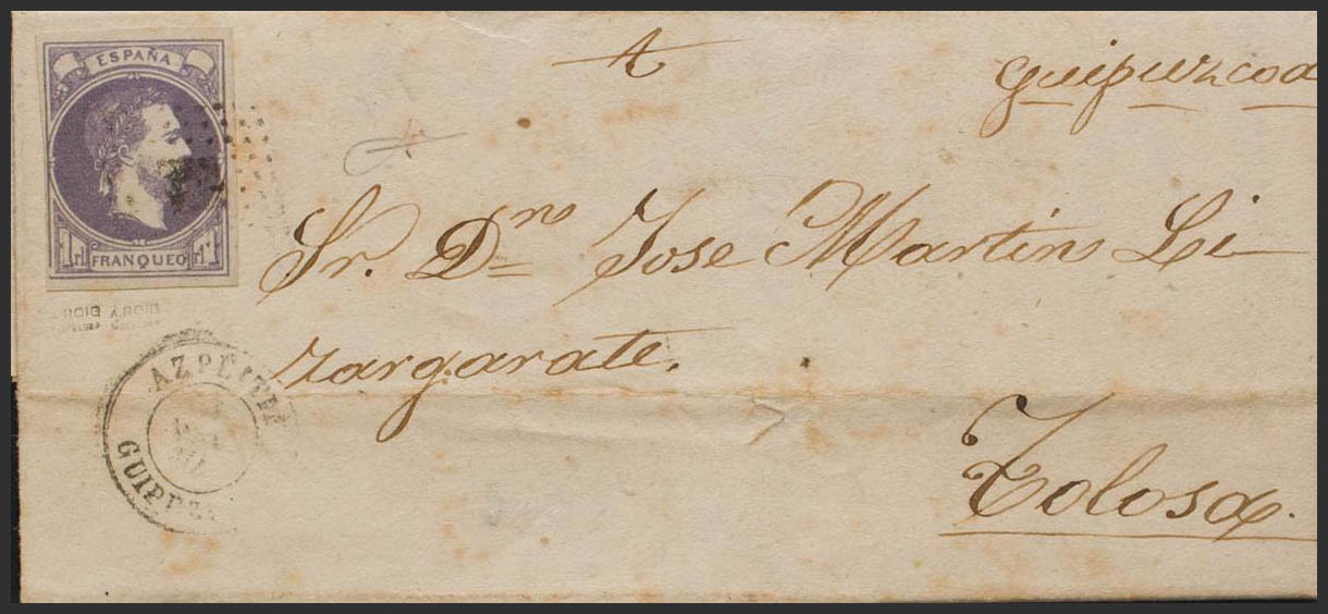 158. 1874. 1 real Violet. AZPEITIA to TOLOSA. DOTTED RHOMBUS postmark. MAGNIFICENT AND VERY SPECTACULAR. Edifil 2018: 1,375 Euros