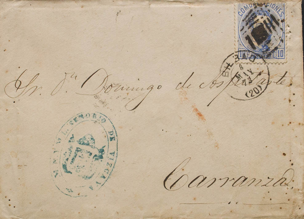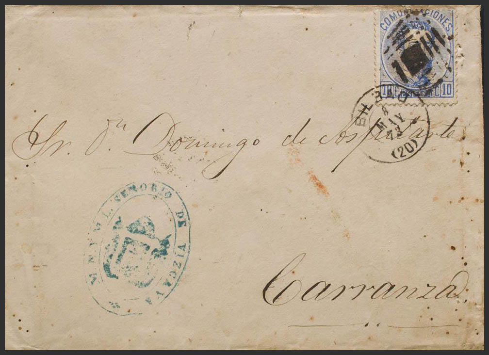 121. 1873. (May 8). 10 cts overseas. BILBAO to CARRANZA (VIZCAYA), traveled by land during the siege of Bilbao by the Carlist troops. On the back handwritten "It has been on the list for 4 months and no one has claimed it, Carranza November 3, 1873, the person in charge, Carranza." MAGNIFICENT AND EXTREMELY RARE CIRCULATED BY LAND VIA AVOIDING THE FENCE OF THE CARLIST TROOPS TO BILBAO.