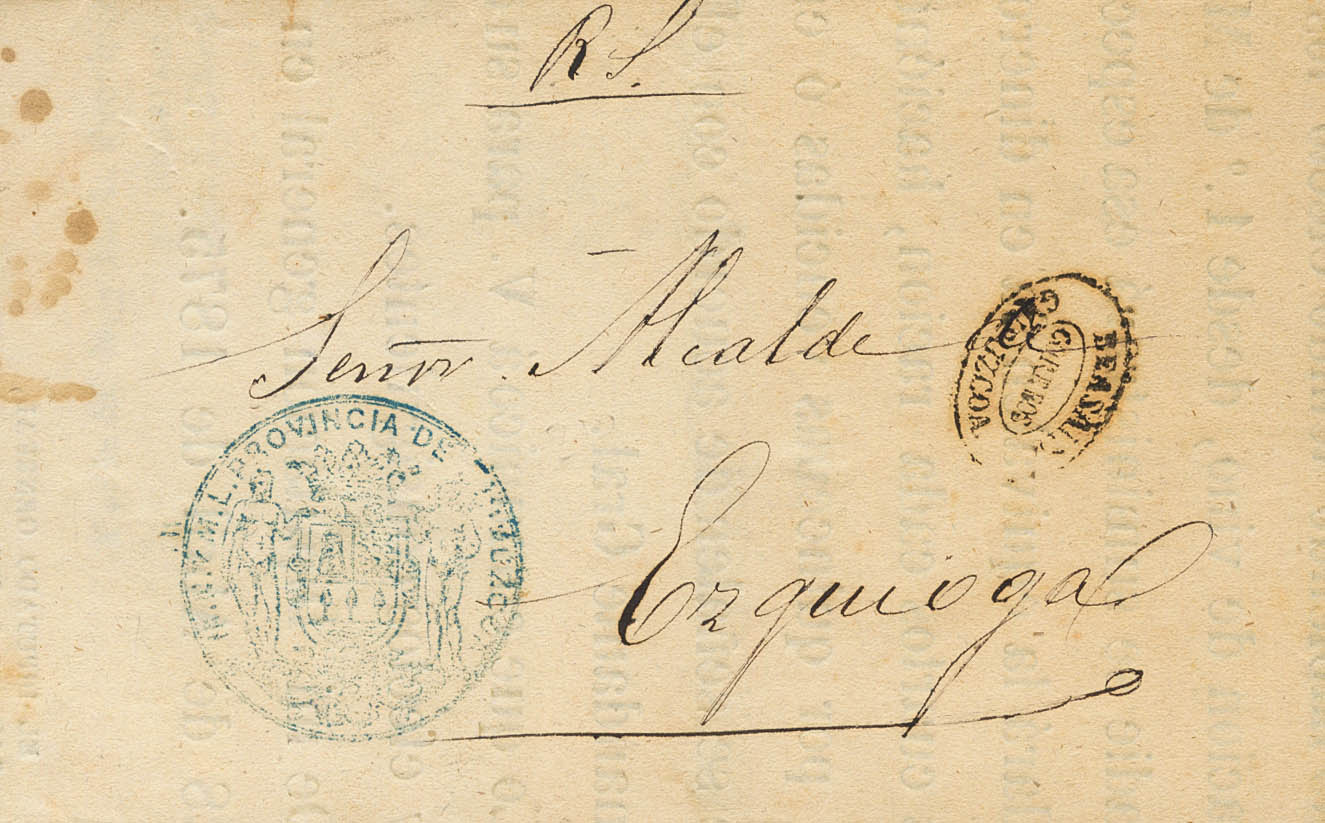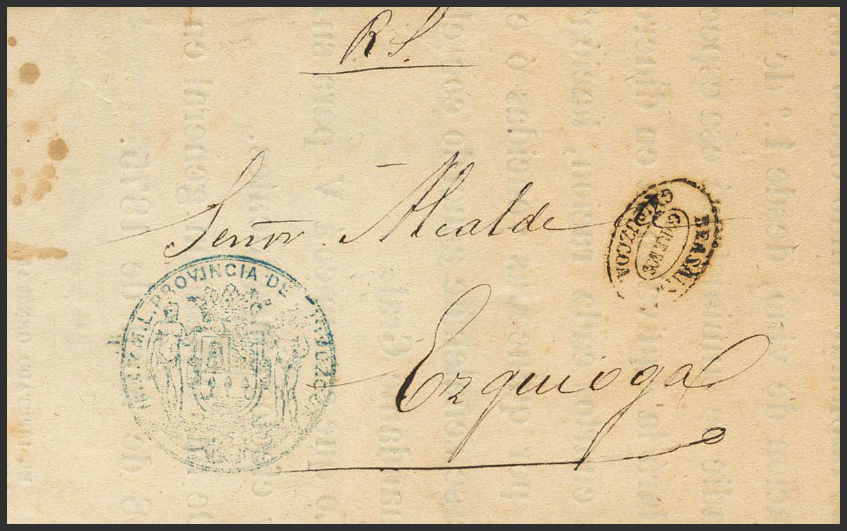 1875. Printed from VILLAFRANCA (GUIPUZCOA) to EZQUIOGA. Franchise brand of the Diputación de Guipuzcoa, in blue and BEASAIN / GUIPUZCOA oval mail, stamped in transit. MAGNIFICENT AND RARE.