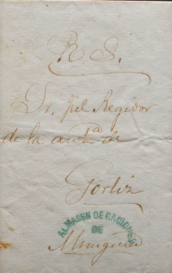 1875. Real Service of MUNGUIA (VIZCAYA) to GORLIZ. Mark ALMACEN DE RACIONES / DE "MUNGUIA", in blue containing a receipt for various provisions inside. MAGNIFICENT AND RARE.