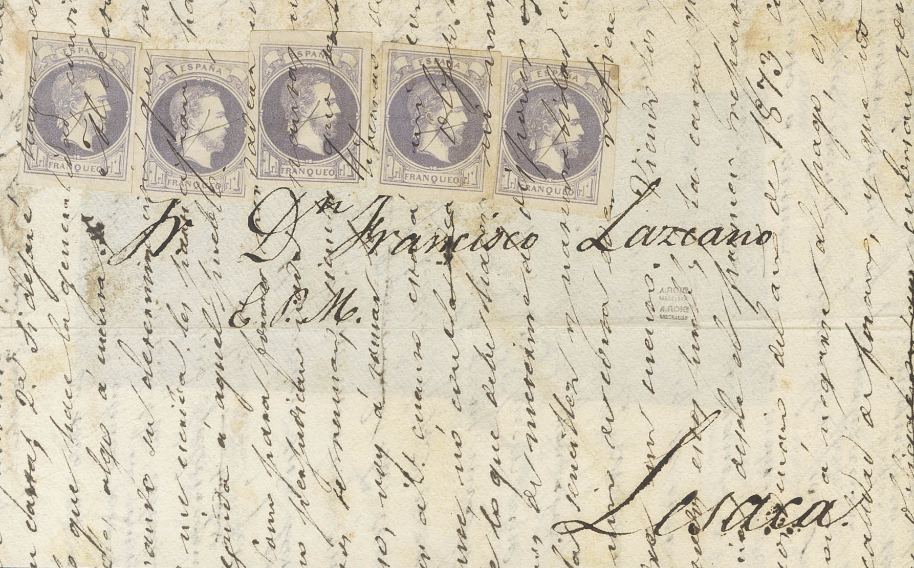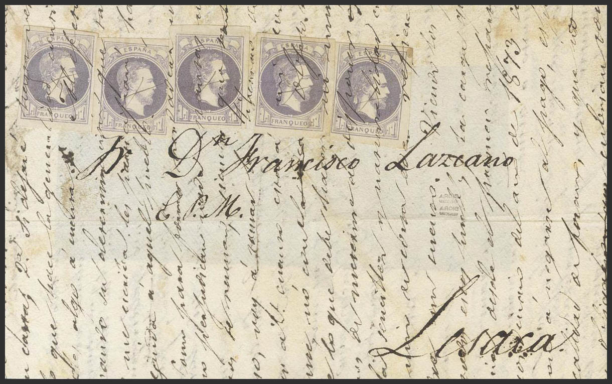 158(5). (1874ca). 1 violet real , five seals. Frontal directed to LESACA (NAVARRA). Unused pen stamps (later the overwritten one was used as a document). MAGNIFICENT AND VERY RARE FIVE POSTAGE POSTAGE, THE GREATEST KNOWN FOR PARTICULAR CARLIST CORRESPONDENCE. Cert. GRAUS.