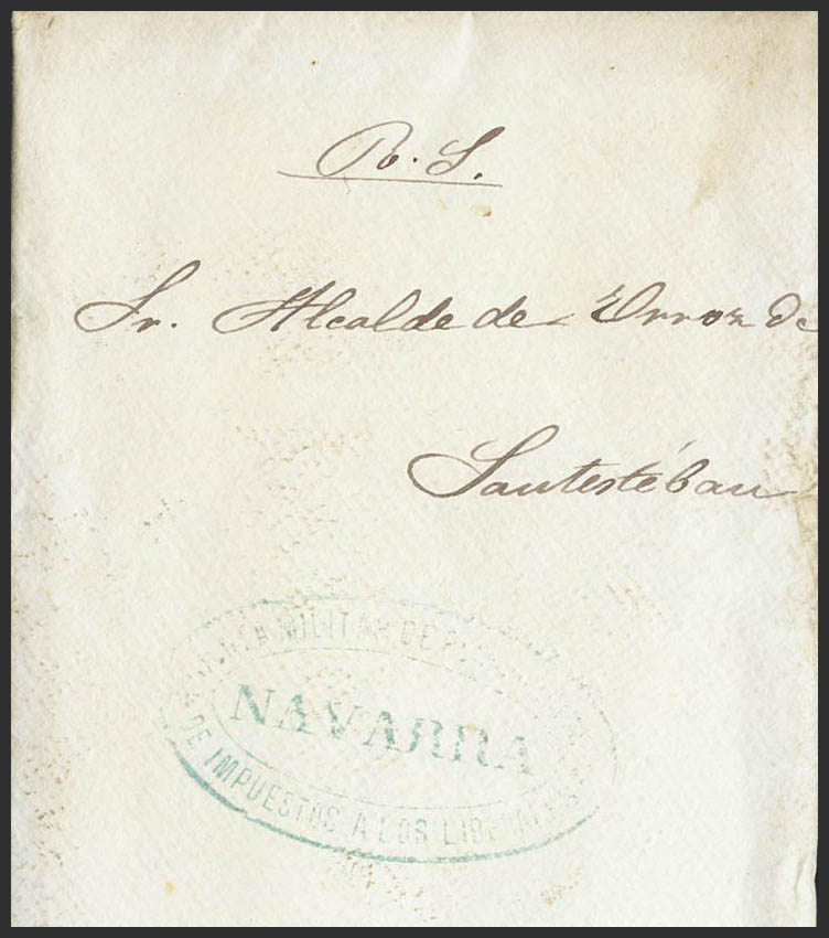 1875. ESTELLA to SANTESTEBAN, circulated during the Third Carlist War. Mark MILITARY COLLECTION BOARD / LIBERAL TAXES / NAVARRA, in blue. MAGNIFICENT AND RARE.