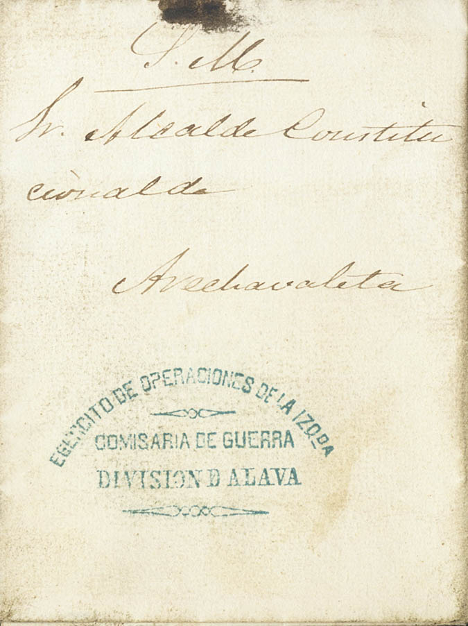 1876. SALINAS DE LENIZ to ARECHAVALETA, circulated a month before the end of the Third Carlist War. Mark ARMY OF LEFT OPERATIONS / WAR COMMISSIONER / DIVISION D ALAVA, in blue. MAGNIFICENT AND RARE.