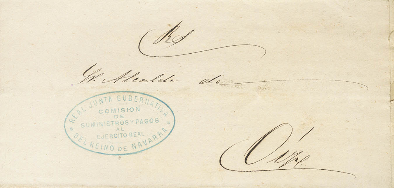 1874. ESTELLA to OIZ. ROYAL GOVERNMENT BOARD / COMMISSION / OF SUPPLIES AND PAYMENTS / TO THE / ROYAL ARMY / OF THE KINGDOM OF NAVARRE mark, in blue. MAGNIFICENT.