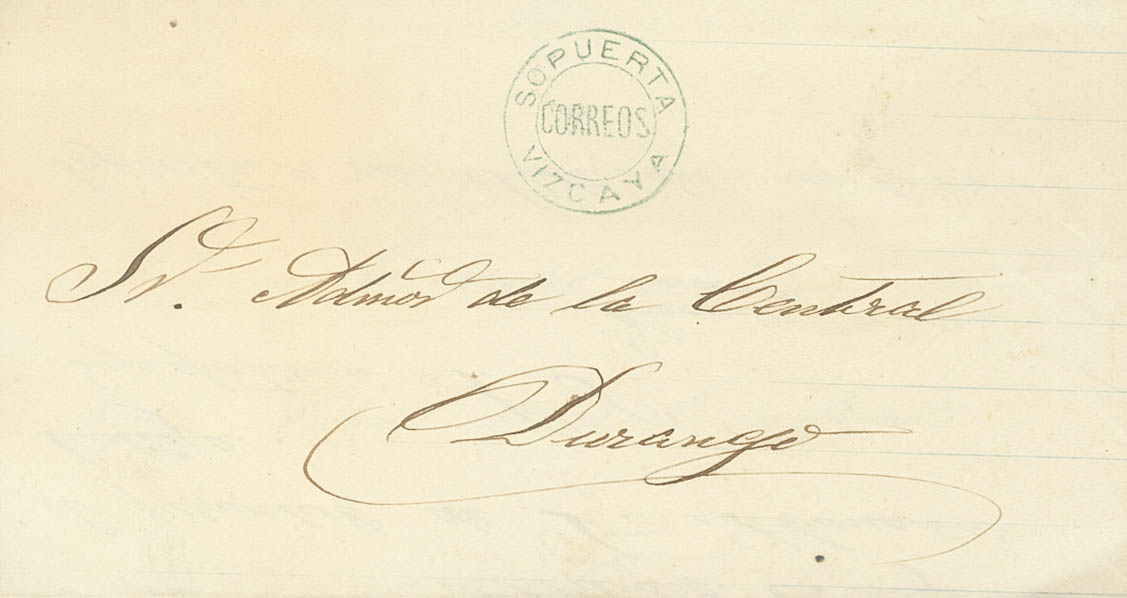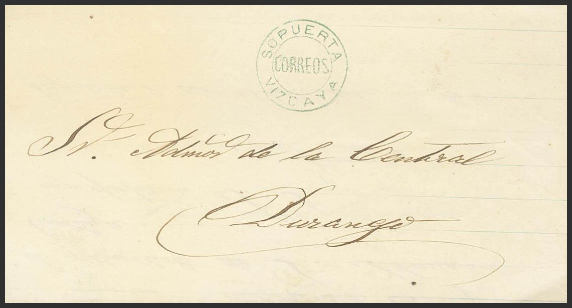 1875. SOPUERTA a DURANGO, circulated during the Third Carlist War. SOPUERTA / CORREOS / VIZCAYA brand, in blue. MAGNIFICENT AND RARE.