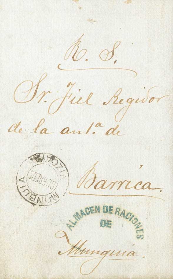 1874. MUNGUIA in BARREL, circulated during the Third Carlist War. Marks MUNGUIA / CORREOS / VIZCAYA, in black and ALMACEN DE RACIONES / DE "MUNGUIA", in blue. MAGNIFICENT AND RARE.
