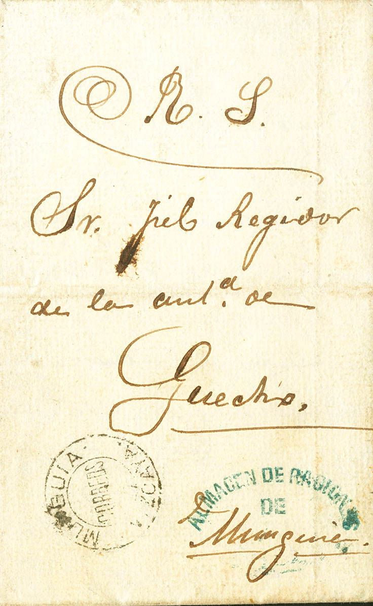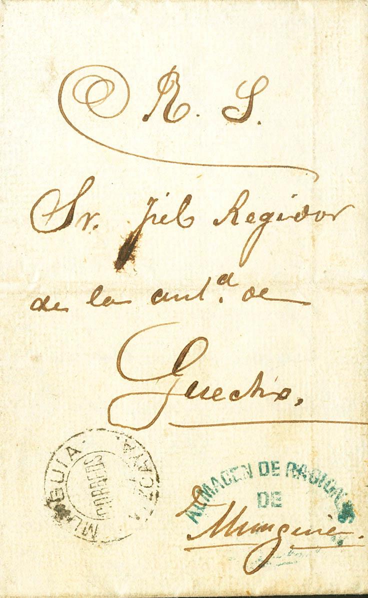 |ABOUT|1875. (December 3). MUNGUIA to GUECHO. Marks RATIONS STORE / FROM / MUNGUIA, in blue and MUNGUIA / CORREOS / VIZCAYA, in black. MAGNIFICENT AND RARE.