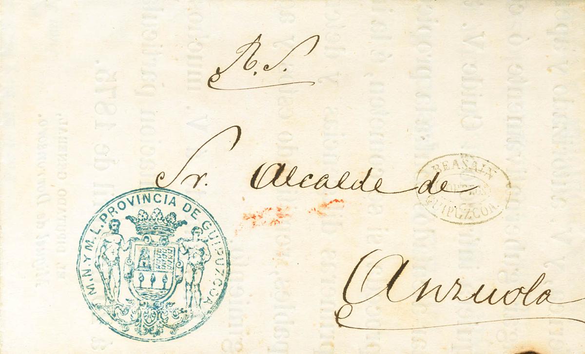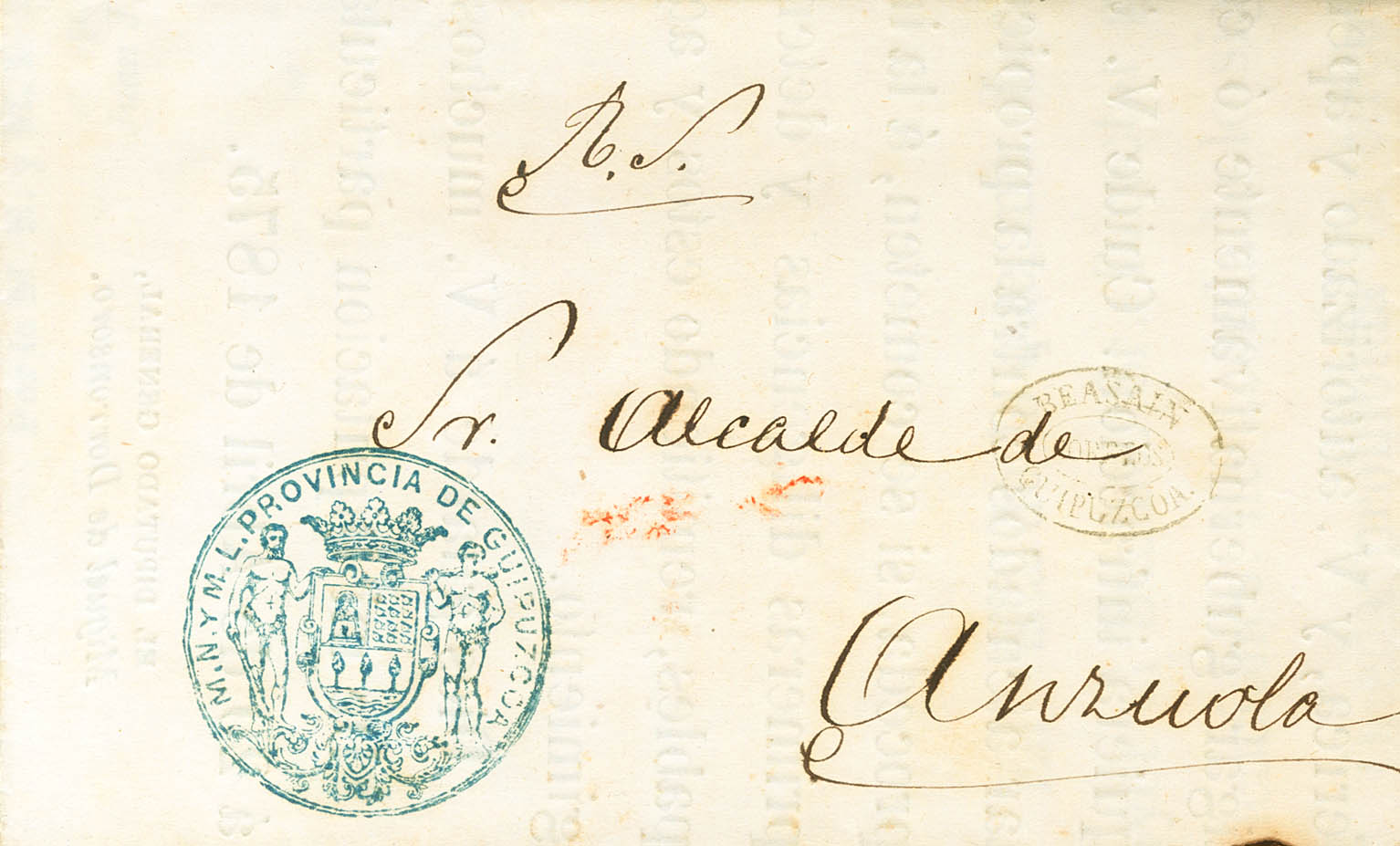|ABOUT|1875. (April 20). Printed circular from VILLAFRANCA DE ORDIZIA to ANZUOLA (GUIPUZCOA). Marks MNY ML PROVINCIA DE GUIPUZCOA, in blue and BEASAIN / CORREOS / GUIPUZCOA, in black. MAGNIFICENT AND RARE.