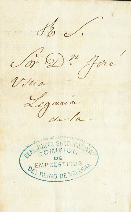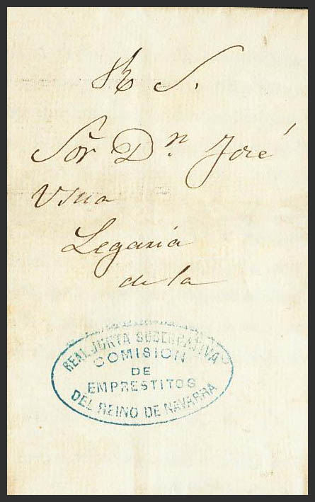 1874. Circular from ARIZALA to the JUNTA DE EMPRESITOS DE NAVARRA (claiming the tax for the Carlist War). Mark ROYAL JUNTA GOVERNATIVA / COMISION / DE / EMPRESITOS / DEL REINO DE NAVARRA, in blue. MAGNIFICENT AND RARE DOCUMENT.