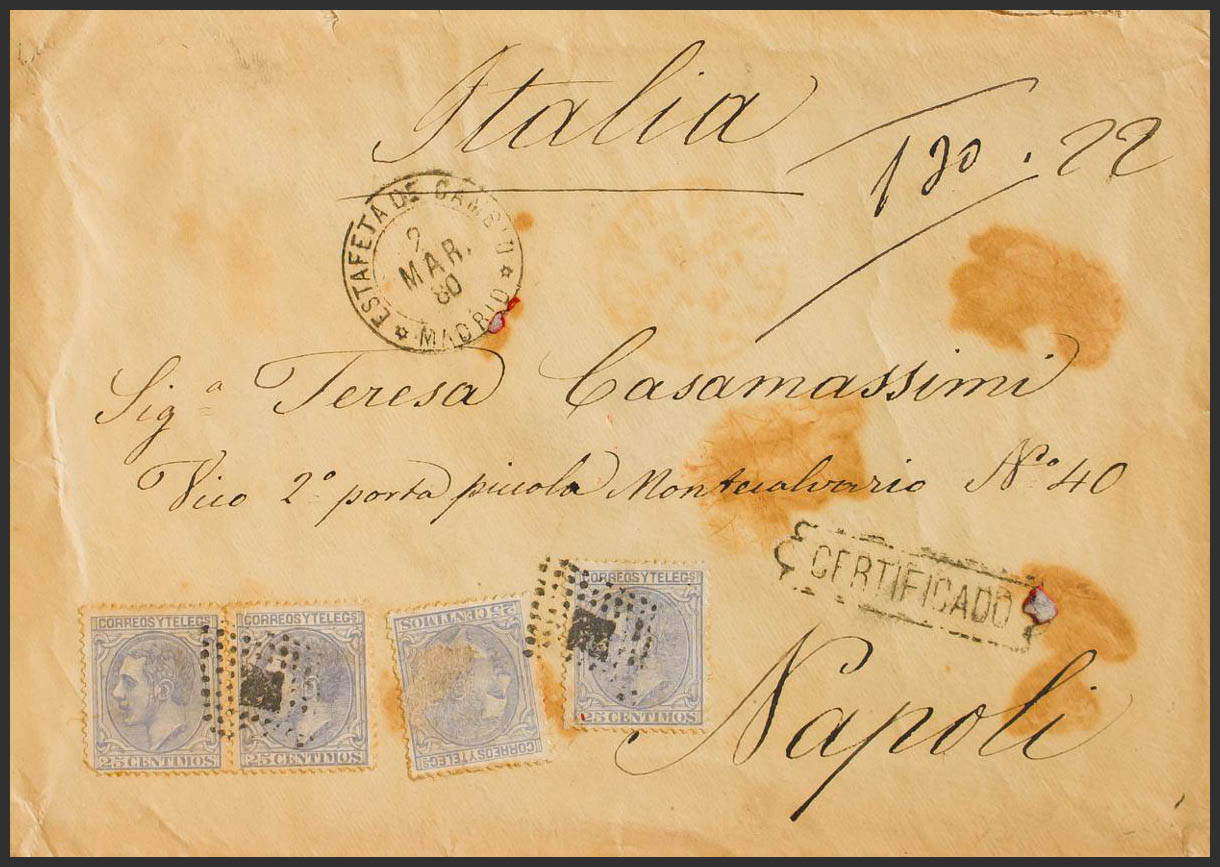 204(4). 1880. 25 cts blue gray, four stamps (minor erosion on one stamp). Certificate from MADRID to NAPLES (ITALY). On the front it marks CERTIFICATE, on the back arrival. BEAUTIFUL AND VERY RARE.