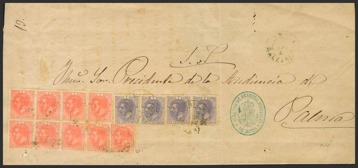 210(9), 212(4). 1884. Orange 15 cts, nine stamps and gray violet 75 cts, strip of four. Judicial Escrow from IBIZA to PALMA DE MALLORCA. MAGNIFICENT AND SPECTACULAR POSTAGE, VERY RARE COMPLETE WRAPPING.