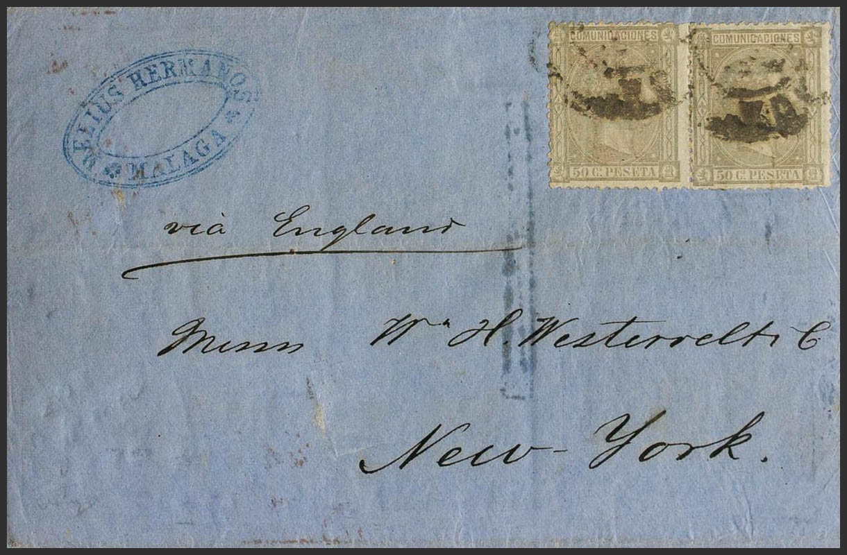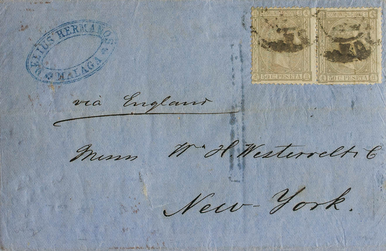English 168(2). 1875. 50 cts lilac, pair. MALAGA to NEW YORK (USA). MAGNIFICENT AND RARE RATE OF FOUR PORTES.
